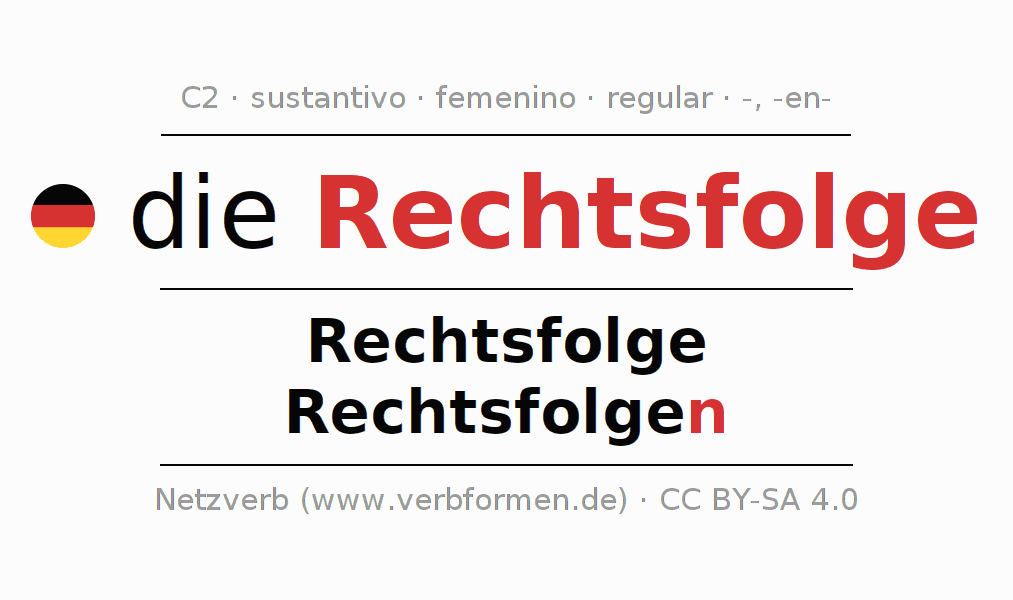 La declinación del sustantivo en forma de tabla con todas su formas: singular, plural y en los cuatro casos: nominativo (primer caso), genitivo (segundo caso), dativo (tercer caso) y acusativo (cuarto caso). Las construcciones gramaticales están representadas de forma clara en una tabla sinópica. La inflexión de los sustantivos es una ayuda durante tareas, exámenes, para cursos de alemán, la universidad, el estudio del alemán como lengua extranjera o como segundo idioma y para estudiantes adultos. La declinación correcta de las palabras es especialmente importante para los que aprenden el idioma alemán. Aquí encontraras más información acerca del tema Wiktionary Rechtsfolge y aquí también a través del Duden Rechtsfolge.