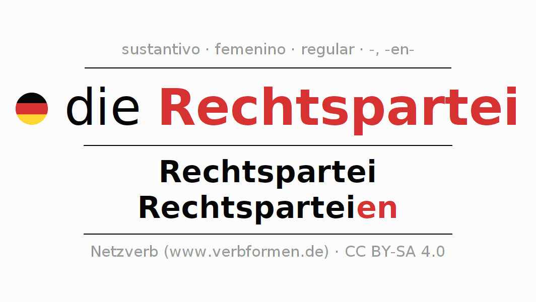 La declinación del sustantivoRechtspartei (partido de derecha, partido conservador) se encuentra en genitivoRechtspartei del singular y en el nominativoRechtsparteien del plural. El sustantivo Rechtspartei se declina de forma débil con las terminaciones -/en. El género gramatical de Rechtspartei es femenino y por eso se requiere el artículo definido ‘die’. Aquí puedes declinar no solamente Rechtspartei sino también todos los sustantivos alemanes . Comentarios ☆