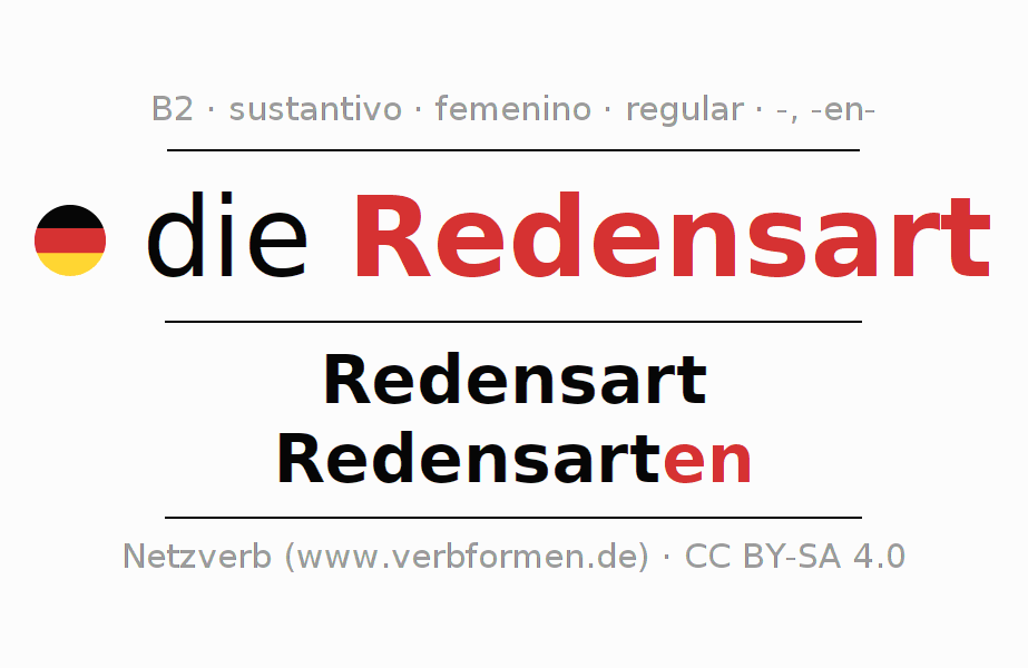 La declinación del sustantivo en forma de tabla con todas su formas: singular, plural y en los cuatro casos: nominativo (primer caso), genitivo (segundo caso), dativo (tercer caso) y acusativo (cuarto caso). Las construcciones gramaticales están representadas de forma clara en una tabla sinópica. La inflexión de los sustantivos es una ayuda durante tareas, exámenes, para cursos de alemán, la universidad, el estudio del alemán como lengua extranjera o como segundo idioma y para estudiantes adultos. La declinación correcta de las palabras es especialmente importante para los que aprenden el idioma alemán. Aquí encontraras más información acerca del tema Wiktionary Redensart y aquí también a través del Duden Redensart.