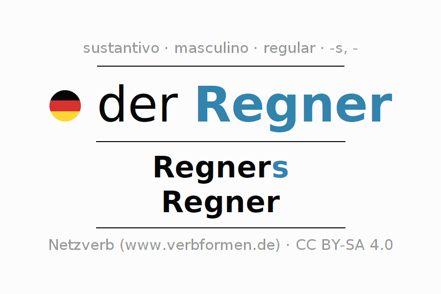 La declinación del sustantivoRegner (aspersor, regador) se encuentra en genitivoRegners del singular y en el nominativoRegner del plural. El sustantivo Regner se conjuga de forma fuerte (irregular) con estas terminaciones s/-. El género gramatical de Regner es masculino y por eso se requiere el artículo definido ‘der’. Aquí puedes declinar no solamente Regner sino también todos los sustantivos alemanes . Comentarios ☆
