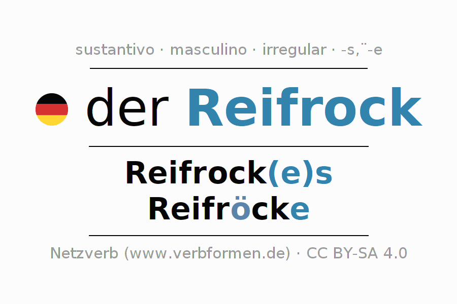 La declinación del sustantivoReifrock (crinolina, falda de aro) se encuentra en genitivoReifrock(e)s del singular y en el nominativoReifröcke del plural. El sustantivo Reifrock se conjuga de forma fuerte (irregular) con estas terminaciones es/ö-e. El plural requiere el uso de diéresis. El género gramatical de Reifrock es masculino y por eso se requiere el artículo definido ‘der’. Aquí puedes declinar no solamente Reifrock sino también todos los sustantivos alemanes . Comentarios ☆
