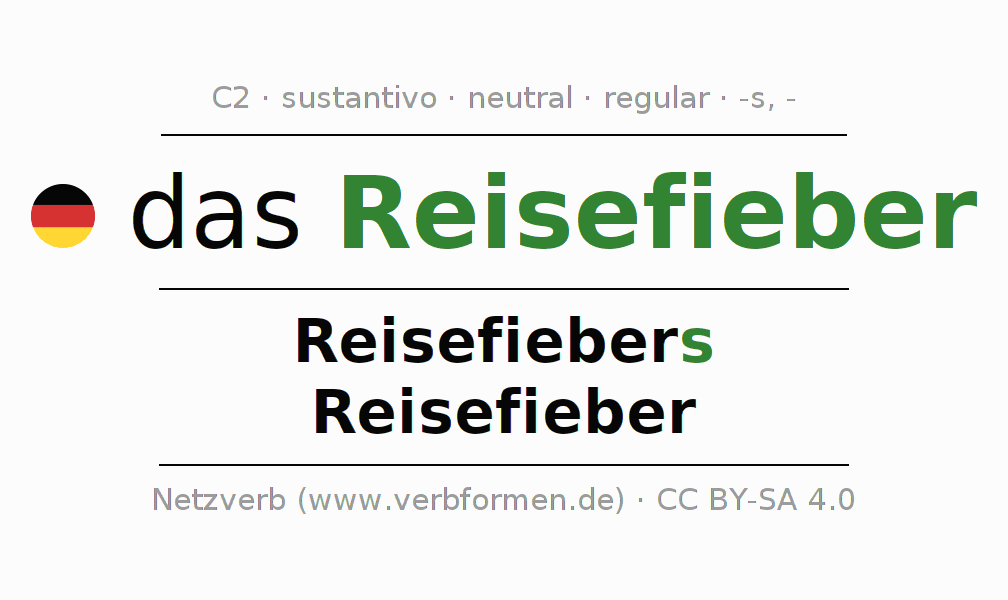 La declinación del sustantivoReisefieber (ansiedad de viaje, fiebre de partida) se encuentra en genitivoReisefiebers del singular y en el nominativoReisefieber del plural. El sustantivo Reisefieber se conjuga de forma fuerte (irregular) con estas terminaciones s/-. El género gramatical de Reisefieber es neutro y por eso se requiere el artículo definido ‘das’. Aquí puedes declinar no solamente Reisefieber sino también todos los sustantivos alemanes . Este sustantivo pertenece al vocabulario necesario para pasar el examen "Zertifikat Deutsch" o para el nivel C2. Comentarios ☆