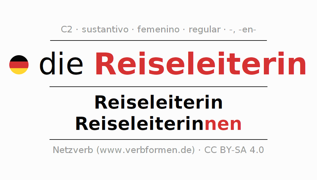 La declinación del sustantivo en forma de tabla con todas su formas: singular, plural y en los cuatro casos: nominativo (primer caso), genitivo (segundo caso), dativo (tercer caso) y acusativo (cuarto caso). Las construcciones gramaticales están representadas de forma clara en una tabla sinópica. La inflexión de los sustantivos es una ayuda durante tareas, exámenes, para cursos de alemán, la universidad, el estudio del alemán como lengua extranjera o como segundo idioma y para estudiantes adultos. La declinación correcta de las palabras es especialmente importante para los que aprenden el idioma alemán. Aquí encontraras más información acerca del tema Wiktionary Reiseleiterin y aquí también a través del Duden Reiseleiterin.