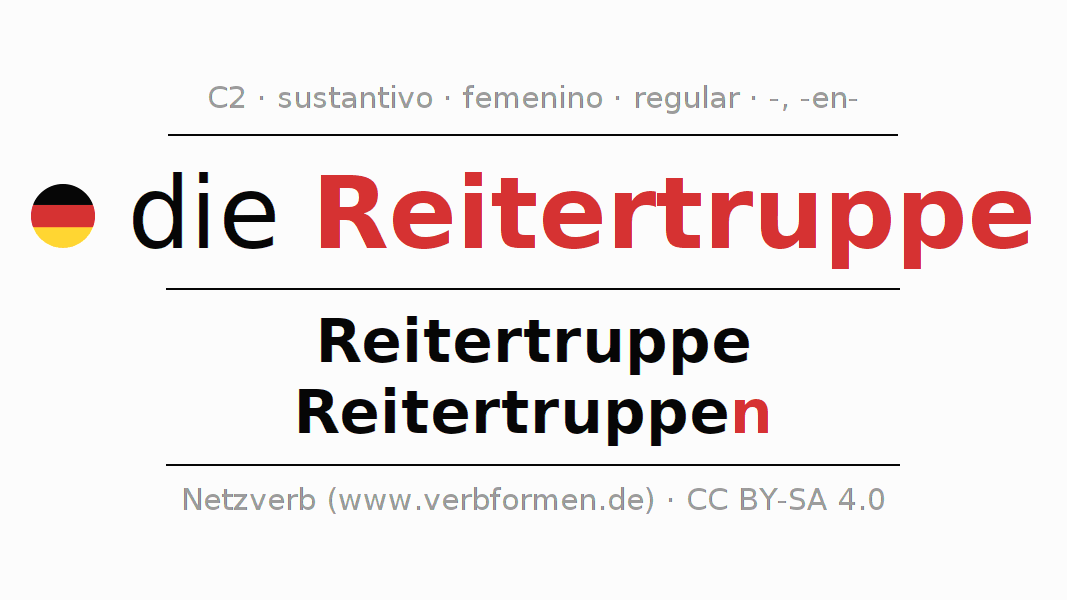 La declinación del sustantivoReitertruppe (tropa de jinetes, unidad de caballería) se encuentra en genitivoReitertruppe del singular y en el nominativoReitertruppen del plural. El sustantivo Reitertruppe se declina de forma débil con las terminaciones -/n. El género gramatical de Reitertruppe es femenino y por eso se requiere el artículo definido ‘die’. Aquí puedes declinar no solamente Reitertruppe sino también todos los sustantivos alemanes . Este sustantivo pertenece al vocabulario necesario para pasar el examen "Zertifikat Deutsch" o para el nivel C2. Comentarios ☆