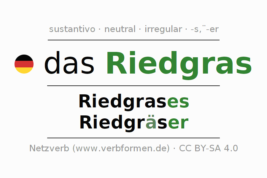 La declinación del sustantivo en forma de tabla con todas su formas: singular, plural y en los cuatro casos: nominativo (primer caso), genitivo (segundo caso), dativo (tercer caso) y acusativo (cuarto caso). Las construcciones gramaticales están representadas de forma clara en una tabla sinópica. La inflexión de los sustantivos es una ayuda durante tareas, exámenes, para cursos de alemán, la universidad, el estudio del alemán como lengua extranjera o como segundo idioma y para estudiantes adultos. La declinación correcta de las palabras es especialmente importante para los que aprenden el idioma alemán. Aquí encontraras más información acerca del tema Wiktionary Riedgras y aquí también a través del Duden Riedgras.