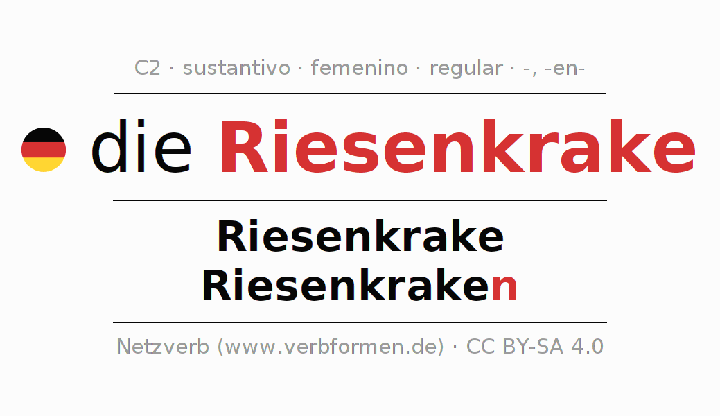 La declinación del sustantivo en forma de tabla con todas su formas: singular, plural y en los cuatro casos: nominativo (primer caso), genitivo (segundo caso), dativo (tercer caso) y acusativo (cuarto caso). Las construcciones gramaticales están representadas de forma clara en una tabla sinópica. La inflexión de los sustantivos es una ayuda durante tareas, exámenes, para cursos de alemán, la universidad, el estudio del alemán como lengua extranjera o como segundo idioma y para estudiantes adultos. La declinación correcta de las palabras es especialmente importante para los que aprenden el idioma alemán. Aquí encontraras más información acerca del tema Wiktionary Riesenkrake y aquí también a través del Duden Riesenkrake.