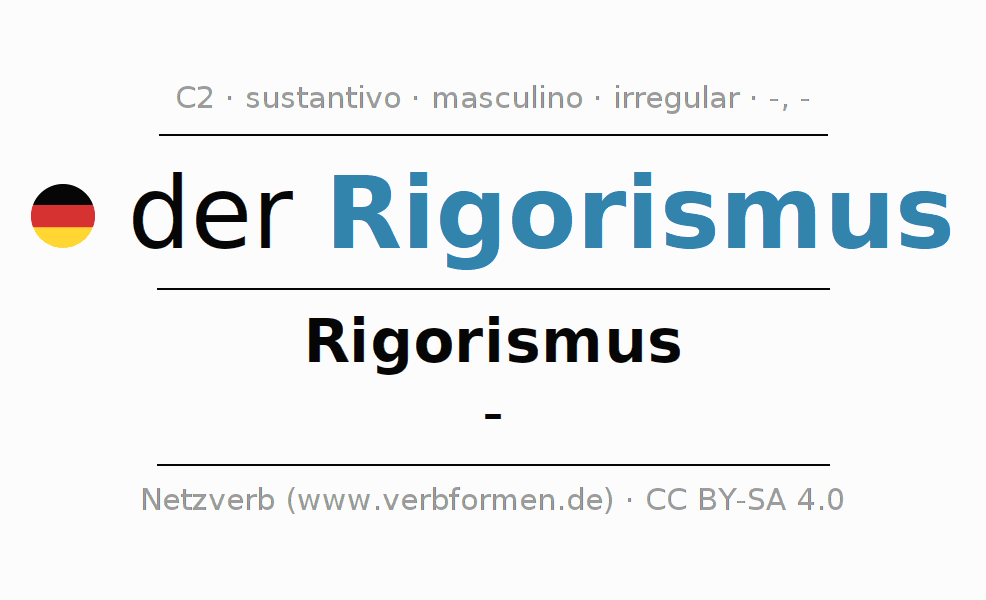 La declinación del sustantivoRigorismus (estrictez, rigorismo) se encuentra en genitivoRigorismus del singular y en el nominativo- del plural. El sustantivo Rigorismus se declina con las terminaciones -/-. No permite construcciones en plural. El género gramatical de Rigorismus es masculino y por eso se requiere el artículo definido ‘der’. Aquí puedes declinar no solamente Rigorismus sino también todos los sustantivos alemanes . Este sustantivo pertenece al vocabulario necesario para pasar el examen "Zertifikat Deutsch" o para el nivel C2. Comentarios ☆