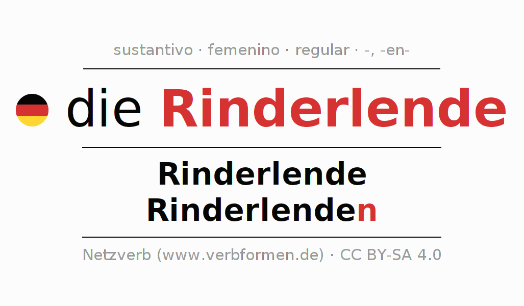 La declinación del sustantivo en forma de tabla con todas su formas: singular, plural y en los cuatro casos: nominativo (primer caso), genitivo (segundo caso), dativo (tercer caso) y acusativo (cuarto caso). Las construcciones gramaticales están representadas de forma clara en una tabla sinópica. La inflexión de los sustantivos es una ayuda durante tareas, exámenes, para cursos de alemán, la universidad, el estudio del alemán como lengua extranjera o como segundo idioma y para estudiantes adultos. La declinación correcta de las palabras es especialmente importante para los que aprenden el idioma alemán. Aquí encontraras más información acerca del tema Wiktionary Rinderlende y aquí también a través del Duden Rinderlende.