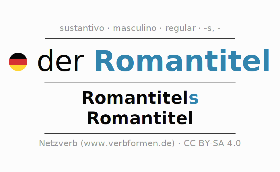 La declinación del sustantivo en forma de tabla con todas su formas: singular, plural y en los cuatro casos: nominativo (primer caso), genitivo (segundo caso), dativo (tercer caso) y acusativo (cuarto caso). Las construcciones gramaticales están representadas de forma clara en una tabla sinópica. La inflexión de los sustantivos es una ayuda durante tareas, exámenes, para cursos de alemán, la universidad, el estudio del alemán como lengua extranjera o como segundo idioma y para estudiantes adultos. La declinación correcta de las palabras es especialmente importante para los que aprenden el idioma alemán. Aquí encontraras más información acerca del tema Wiktionary Romantitel y aquí también a través del Duden Romantitel.