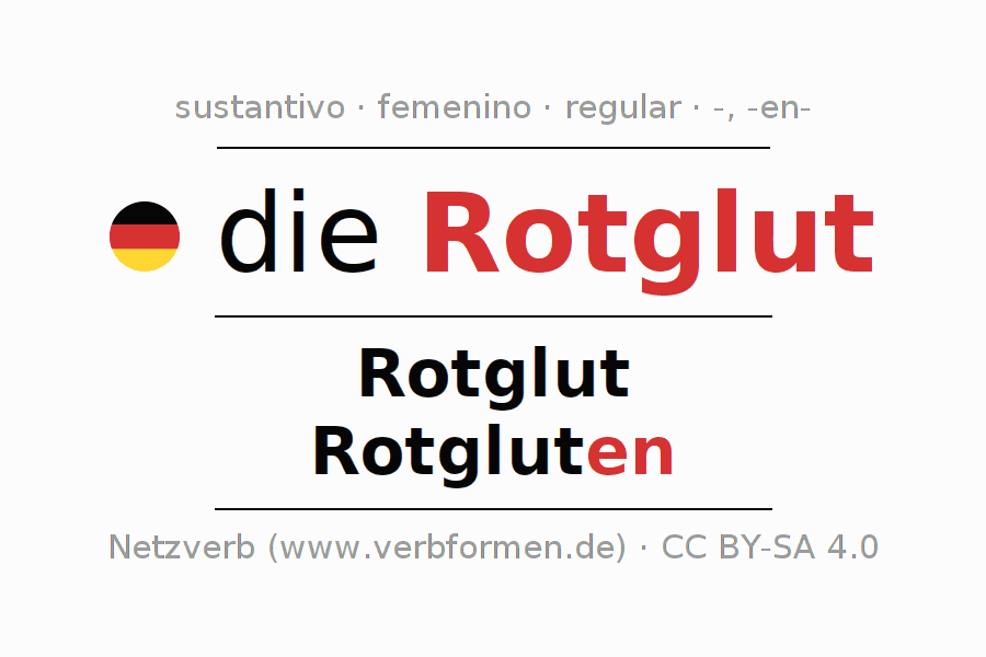 La declinación del sustantivoRotglut (calor intenso, calor rojo) se encuentra en genitivoRotglut del singular y en el nominativoRotgluten del plural. El sustantivo Rotglut se declina de forma débil con las terminaciones -/en. El género gramatical de Rotglut es femenino y por eso se requiere el artículo definido ‘die’. Aquí puedes declinar no solamente Rotglut sino también todos los sustantivos alemanes . Comentarios ☆