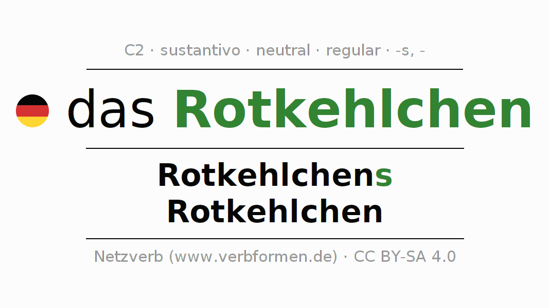 La declinación del sustantivoRotkehlchen (petirrojo, pardillo) se encuentra en genitivoRotkehlchens del singular y en el nominativoRotkehlchen del plural. El sustantivo Rotkehlchen se conjuga de forma fuerte (irregular) con estas terminaciones s/-. El género gramatical de Rotkehlchen es neutro y por eso se requiere el artículo definido ‘das’. Aquí puedes declinar no solamente Rotkehlchen sino también todos los sustantivos alemanes . Este sustantivo pertenece al vocabulario necesario para pasar el examen "Zertifikat Deutsch" o para el nivel C2. Comentarios ☆