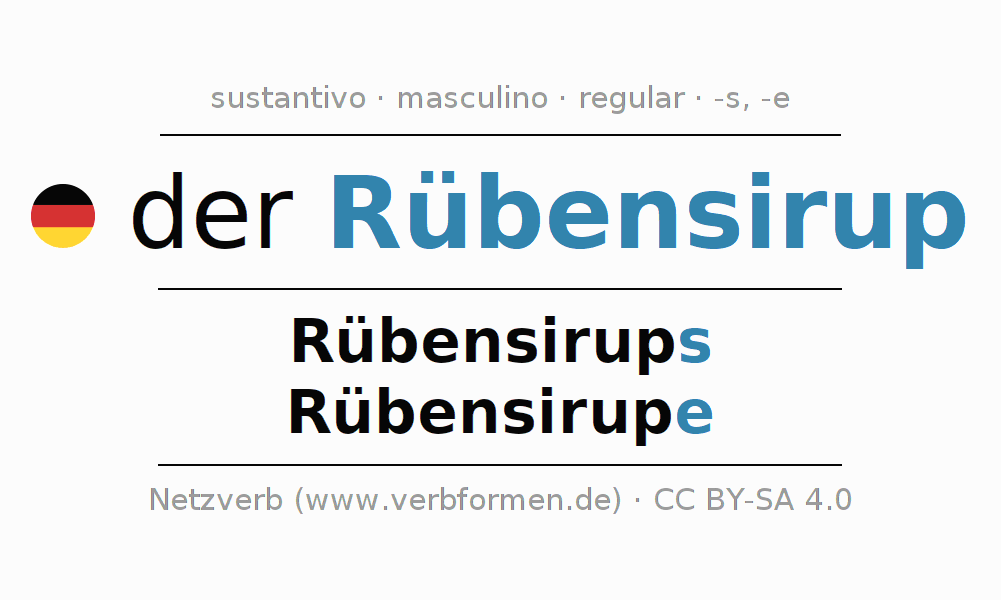 La declinación del sustantivo en forma de tabla con todas su formas: singular, plural y en los cuatro casos: nominativo (primer caso), genitivo (segundo caso), dativo (tercer caso) y acusativo (cuarto caso). Las construcciones gramaticales están representadas de forma clara en una tabla sinópica. La inflexión de los sustantivos es una ayuda durante tareas, exámenes, para cursos de alemán, la universidad, el estudio del alemán como lengua extranjera o como segundo idioma y para estudiantes adultos. La declinación correcta de las palabras es especialmente importante para los que aprenden el idioma alemán. Aquí encontraras más información acerca del tema Wiktionary Rübensirup y aquí también a través del Duden Rübensirup.