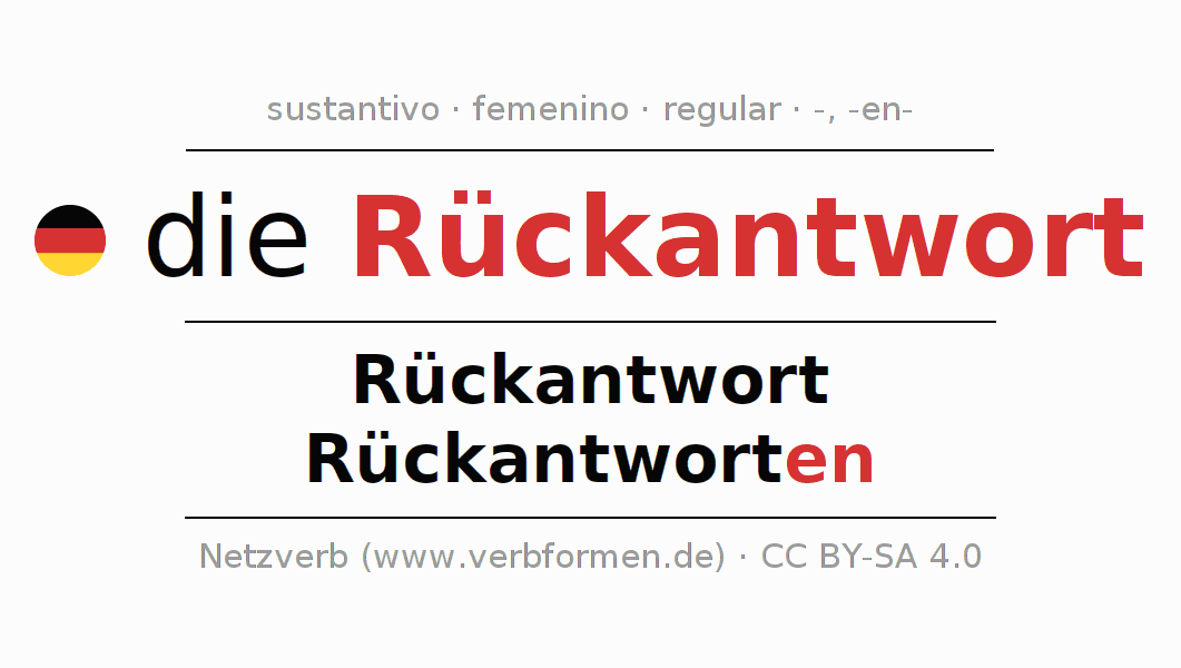 La declinación del sustantivoRückantwort (respuesta, contestación) se encuentra en genitivoRückantwort del singular y en el nominativoRückantworten del plural. El sustantivo Rückantwort se declina de forma débil con las terminaciones -/en. El género gramatical de Rückantwort es femenino y por eso se requiere el artículo definido ‘die’. Aquí puedes declinar no solamente Rückantwort sino también todos los sustantivos alemanes . Comentarios ☆