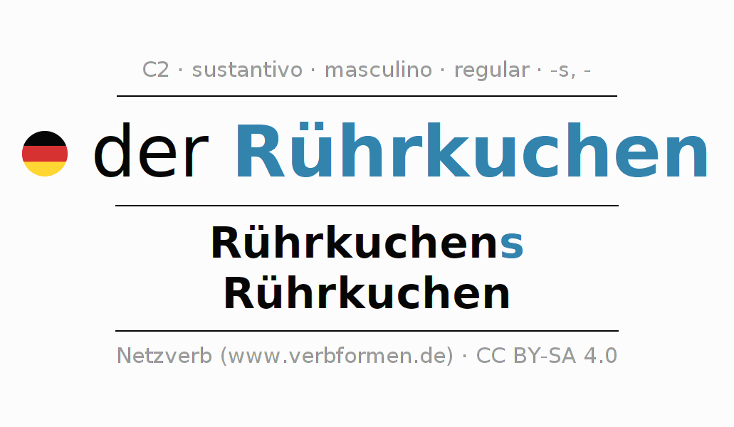 La declinación del sustantivo en forma de tabla con todas su formas: singular, plural y en los cuatro casos: nominativo (primer caso), genitivo (segundo caso), dativo (tercer caso) y acusativo (cuarto caso). Las construcciones gramaticales están representadas de forma clara en una tabla sinópica. La inflexión de los sustantivos es una ayuda durante tareas, exámenes, para cursos de alemán, la universidad, el estudio del alemán como lengua extranjera o como segundo idioma y para estudiantes adultos. La declinación correcta de las palabras es especialmente importante para los que aprenden el idioma alemán. Aquí encontraras más información acerca del tema Wiktionary Rührkuchen y aquí también a través del Duden Rührkuchen.