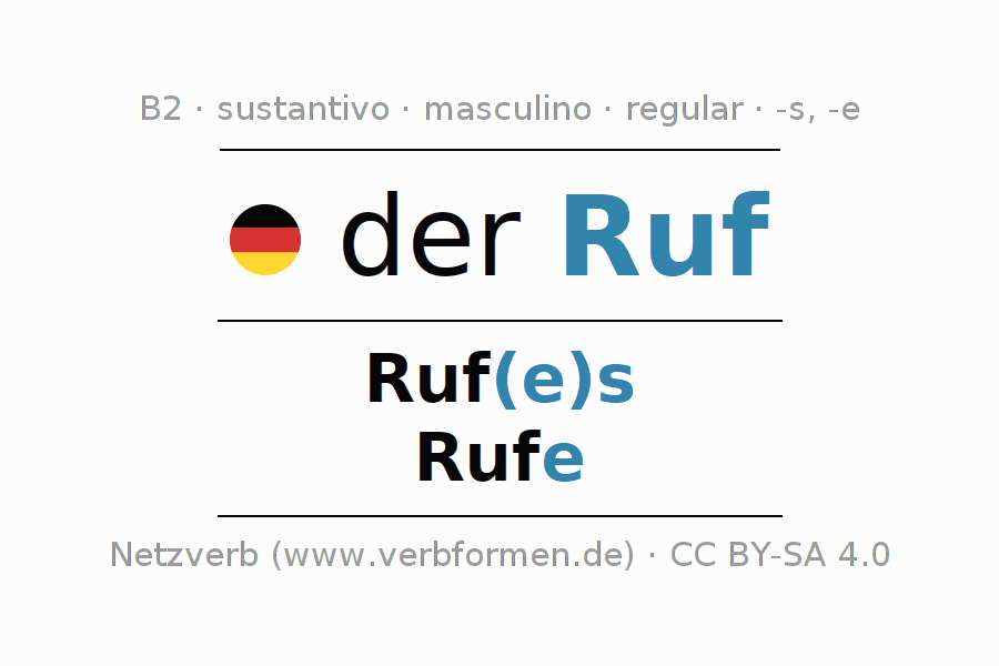 La declinación del sustantivoRuf (llamada, reputación) se encuentra en genitivoRuf(e)s del singular y en el nominativoRufe del plural. El sustantivo Ruf se conjuga de forma fuerte (irregular) con estas terminaciones es/e. El género gramatical de Ruf es masculino y por eso se requiere el artículo definido ‘der’. Aquí puedes declinar no solamente Ruf sino también todos los sustantivos alemanes . Este sustantivo pertenece al vocabulario necesario para pasar el examen "Zertifikat Deutsch" o para el nivel B2. Comentarios ☆