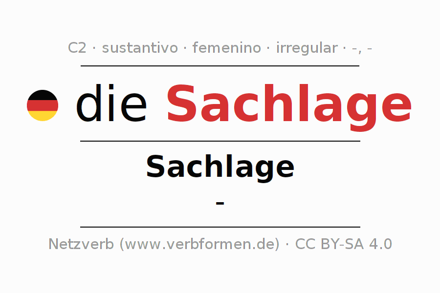 La declinación del sustantivo en forma de tabla con todas su formas: singular, plural y en los cuatro casos: nominativo (primer caso), genitivo (segundo caso), dativo (tercer caso) y acusativo (cuarto caso). Las construcciones gramaticales están representadas de forma clara en una tabla sinópica. La inflexión de los sustantivos es una ayuda durante tareas, exámenes, para cursos de alemán, la universidad, el estudio del alemán como lengua extranjera o como segundo idioma y para estudiantes adultos. La declinación correcta de las palabras es especialmente importante para los que aprenden el idioma alemán. Aquí encontraras más información acerca del tema Wiktionary Sachlage y aquí también a través del Duden Sachlage.