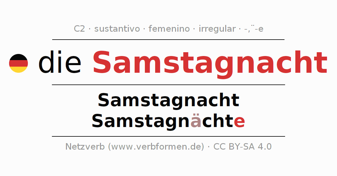 La declinación del sustantivoSamstagnacht (noche del sábado) se encuentra en genitivoSamstagnacht del singular y en el nominativoSamstagnächte del plural. El sustantivo Samstagnacht se conjuga de forma fuerte (irregular) con estas terminaciones -/ä-e. El plural requiere el uso de diéresis. El género gramatical de Samstagnacht es femenino y por eso se requiere el artículo definido ‘die’. Aquí puedes declinar no solamente Samstagnacht sino también todos los sustantivos alemanes . Este sustantivo pertenece al vocabulario necesario para pasar el examen "Zertifikat Deutsch" o para el nivel C2. Comentarios ☆