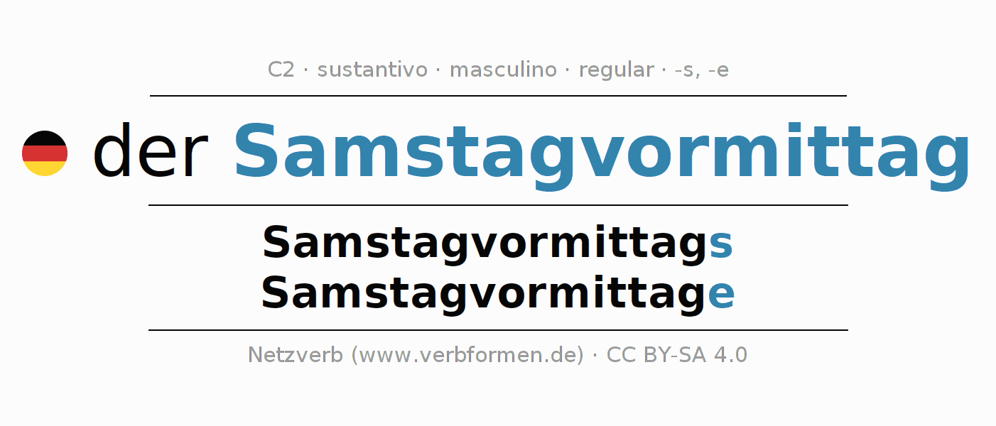 La declinación del sustantivo en forma de tabla con todas su formas: singular, plural y en los cuatro casos: nominativo (primer caso), genitivo (segundo caso), dativo (tercer caso) y acusativo (cuarto caso). Las construcciones gramaticales están representadas de forma clara en una tabla sinópica. La inflexión de los sustantivos es una ayuda durante tareas, exámenes, para cursos de alemán, la universidad, el estudio del alemán como lengua extranjera o como segundo idioma y para estudiantes adultos. La declinación correcta de las palabras es especialmente importante para los que aprenden el idioma alemán. Aquí encontraras más información acerca del tema Wiktionary Samstagvormittag y aquí también a través del Duden Samstagvormittag.
