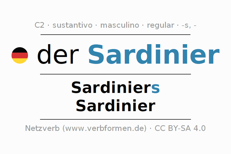 La declinación del sustantivo en forma de tabla con todas su formas: singular, plural y en los cuatro casos: nominativo (primer caso), genitivo (segundo caso), dativo (tercer caso) y acusativo (cuarto caso). Las construcciones gramaticales están representadas de forma clara en una tabla sinópica. La inflexión de los sustantivos es una ayuda durante tareas, exámenes, para cursos de alemán, la universidad, el estudio del alemán como lengua extranjera o como segundo idioma y para estudiantes adultos. La declinación correcta de las palabras es especialmente importante para los que aprenden el idioma alemán. Aquí encontraras más información acerca del tema Wiktionary Sardinier y aquí también a través del Duden Sardinier.
