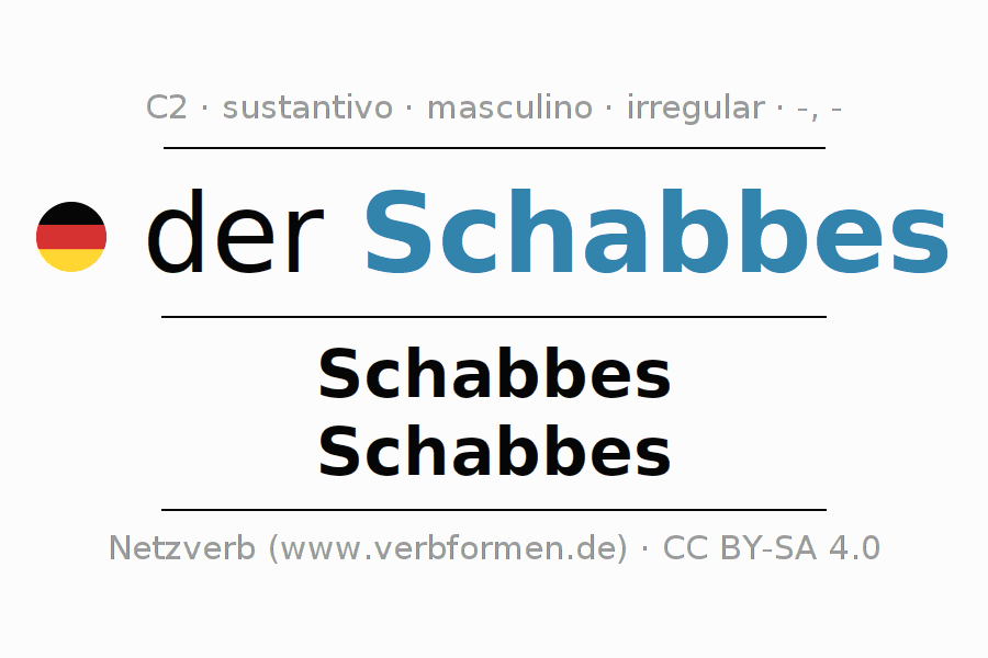 La declinación del sustantivoSchabbes (Shabat, sábado) se encuentra en genitivoSchabbes del singular y en el nominativoSchabbes del plural. El sustantivo Schabbes se declina con las terminaciones -/-. El género gramatical de Schabbes es masculino y por eso se requiere el artículo definido ‘der’. Aquí puedes declinar no solamente Schabbes sino también todos los sustantivos alemanes . Este sustantivo pertenece al vocabulario necesario para pasar el examen "Zertifikat Deutsch" o para el nivel C2. Comentarios ☆