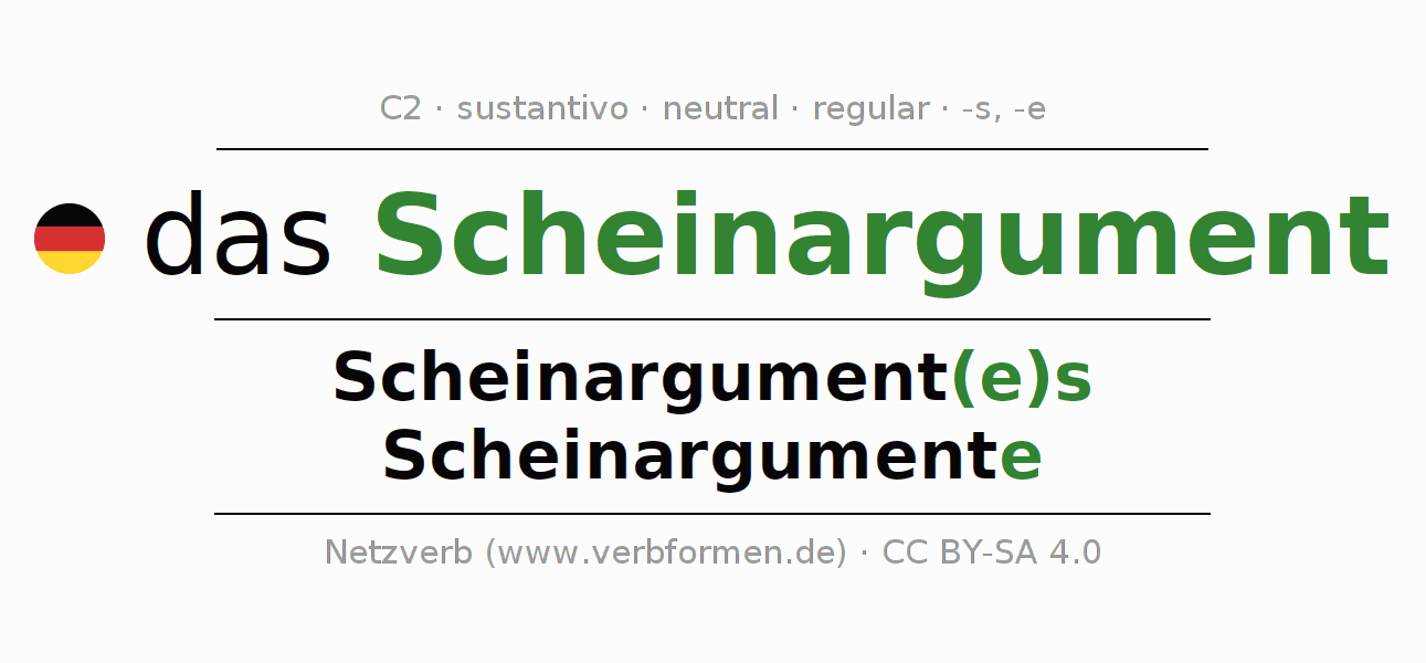 La declinación del sustantivoScheinargument (argumento engañoso, falsa argumentación) se encuentra en genitivoScheinargument(e)s del singular y en el nominativoScheinargumente del plural. El sustantivo Scheinargument se conjuga de forma fuerte (irregular) con estas terminaciones es/e. El género gramatical de Scheinargument es neutro y por eso se requiere el artículo definido ‘das’. Aquí puedes declinar no solamente Scheinargument sino también todos los sustantivos alemanes . Este sustantivo pertenece al vocabulario necesario para pasar el examen "Zertifikat Deutsch" o para el nivel C2. Comentarios ☆