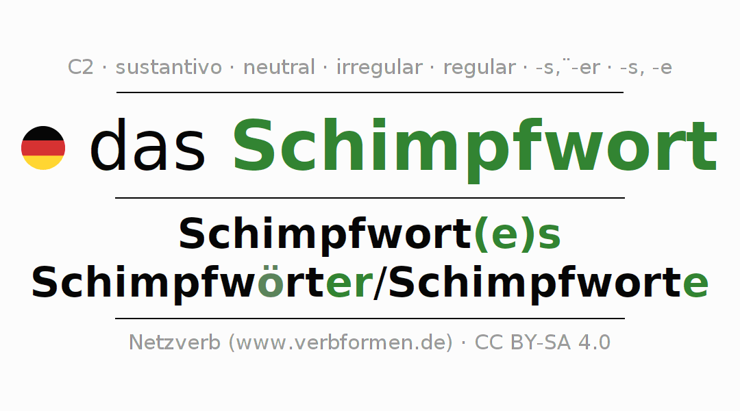 La declinación del sustantivoSchimpfwort (insulto, garabato) se encuentra en genitivoSchimpfwort(e)s del singular y en el nominativoSchimpfwörter/Schimpfworte del plural. El sustantivo Schimpfwort se conjuga de forma fuerte (irregular) con estas terminaciones es/ö-er/e. El plural requiere el uso de diéresis. El género gramatical de Schimpfwort es neutro y por eso se requiere el artículo definido ‘das’. Aquí puedes declinar no solamente Schimpfwort sino también todos los sustantivos alemanes . Este sustantivo pertenece al vocabulario necesario para pasar el examen "Zertifikat Deutsch" o para el nivel C2. Comentarios ☆