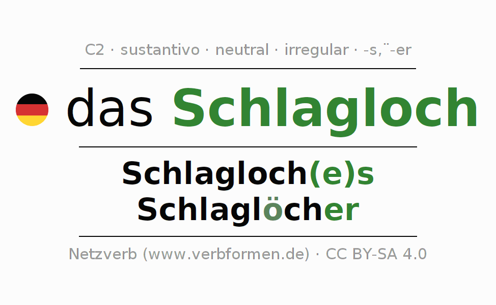 La declinación del sustantivo en forma de tabla con todas su formas: singular, plural y en los cuatro casos: nominativo (primer caso), genitivo (segundo caso), dativo (tercer caso) y acusativo (cuarto caso). Las construcciones gramaticales están representadas de forma clara en una tabla sinópica. La inflexión de los sustantivos es una ayuda durante tareas, exámenes, para cursos de alemán, la universidad, el estudio del alemán como lengua extranjera o como segundo idioma y para estudiantes adultos. La declinación correcta de las palabras es especialmente importante para los que aprenden el idioma alemán. Aquí encontraras más información acerca del tema Wiktionary Schlagloch y aquí también a través del Duden Schlagloch.