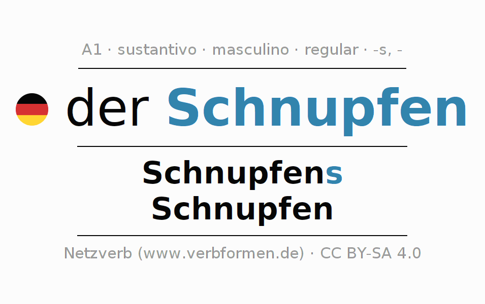 La declinación del sustantivo en forma de tabla con todas su formas: singular, plural y en los cuatro casos: nominativo (primer caso), genitivo (segundo caso), dativo (tercer caso) y acusativo (cuarto caso). Las construcciones gramaticales están representadas de forma clara en una tabla sinópica. La inflexión de los sustantivos es una ayuda durante tareas, exámenes, para cursos de alemán, la universidad, el estudio del alemán como lengua extranjera o como segundo idioma y para estudiantes adultos. La declinación correcta de las palabras es especialmente importante para los que aprenden el idioma alemán. Aquí encontraras más información acerca del tema Wiktionary Schnupfen y aquí también a través del Duden Schnupfen.
