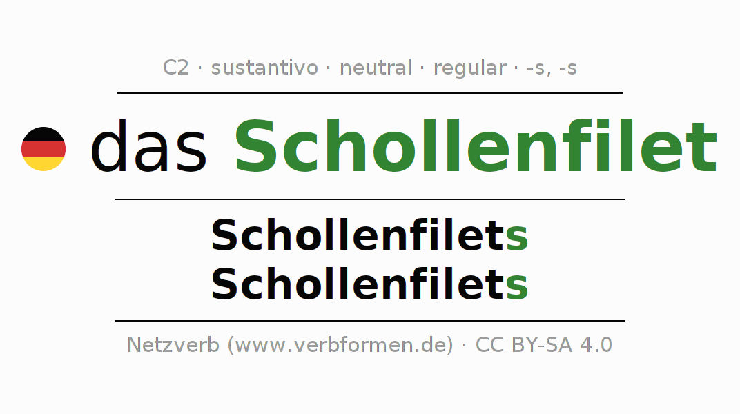 La declinación del sustantivo en forma de tabla con todas su formas: singular, plural y en los cuatro casos: nominativo (primer caso), genitivo (segundo caso), dativo (tercer caso) y acusativo (cuarto caso). Las construcciones gramaticales están representadas de forma clara en una tabla sinópica. La inflexión de los sustantivos es una ayuda durante tareas, exámenes, para cursos de alemán, la universidad, el estudio del alemán como lengua extranjera o como segundo idioma y para estudiantes adultos. La declinación correcta de las palabras es especialmente importante para los que aprenden el idioma alemán. Aquí encontraras más información acerca del tema Wiktionary Schollenfilet y aquí también a través del Duden Schollenfilet.
