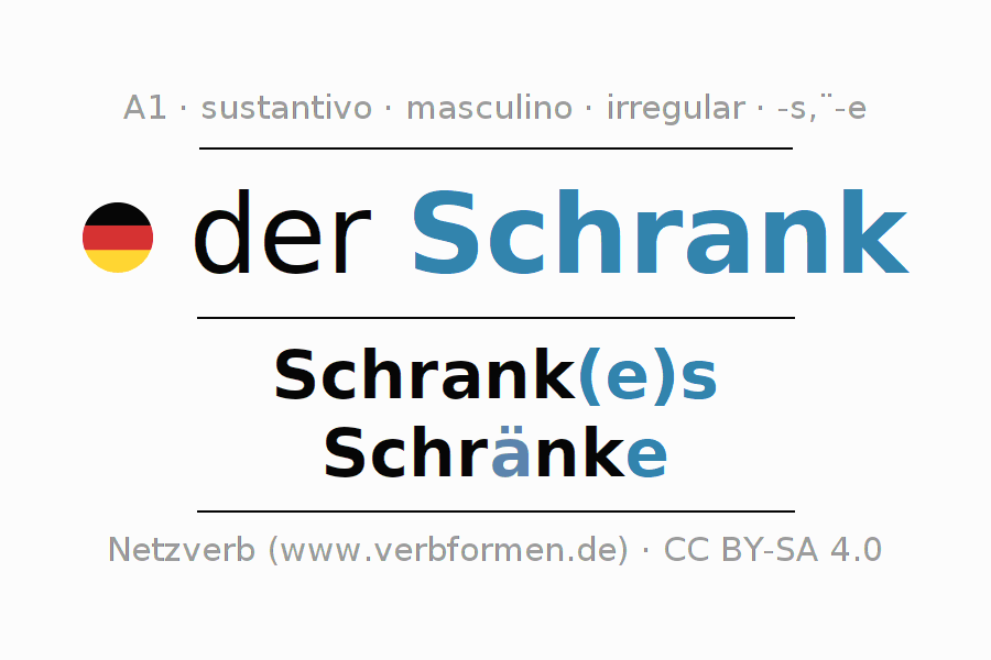 La declinación del sustantivo en forma de tabla con todas su formas: singular, plural y en los cuatro casos: nominativo (primer caso), genitivo (segundo caso), dativo (tercer caso) y acusativo (cuarto caso). Las construcciones gramaticales están representadas de forma clara en una tabla sinópica. La inflexión de los sustantivos es una ayuda durante tareas, exámenes, para cursos de alemán, la universidad, el estudio del alemán como lengua extranjera o como segundo idioma y para estudiantes adultos. La declinación correcta de las palabras es especialmente importante para los que aprenden el idioma alemán. Aquí encontraras más información acerca del tema Wiktionary Schrank y aquí también a través del Duden Schrank.