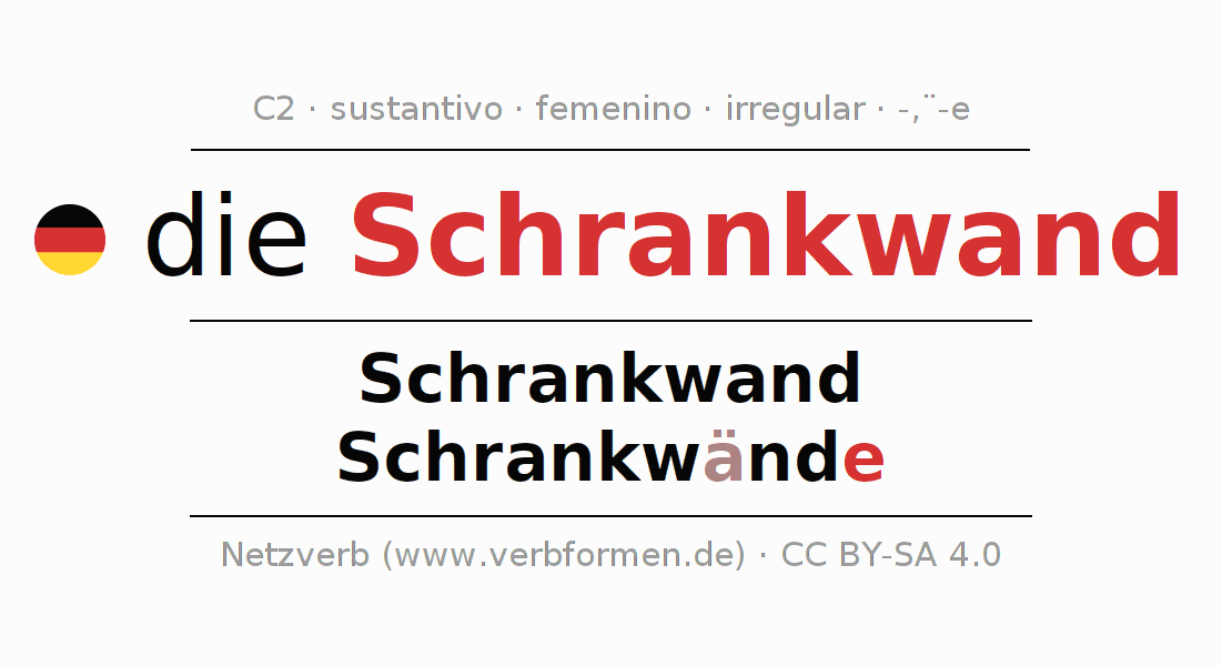 La declinación del sustantivo en forma de tabla con todas su formas: singular, plural y en los cuatro casos: nominativo (primer caso), genitivo (segundo caso), dativo (tercer caso) y acusativo (cuarto caso). Las construcciones gramaticales están representadas de forma clara en una tabla sinópica. La inflexión de los sustantivos es una ayuda durante tareas, exámenes, para cursos de alemán, la universidad, el estudio del alemán como lengua extranjera o como segundo idioma y para estudiantes adultos. La declinación correcta de las palabras es especialmente importante para los que aprenden el idioma alemán. Aquí encontraras más información acerca del tema Wiktionary Schrankwand y aquí también a través del Duden Schrankwand.