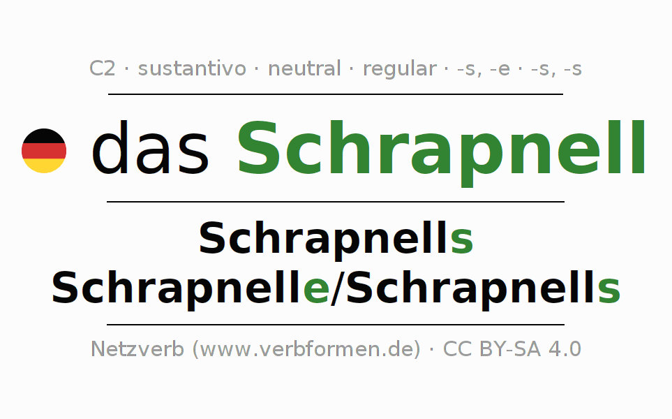 La declinación del sustantivo en forma de tabla con todas su formas: singular, plural y en los cuatro casos: nominativo (primer caso), genitivo (segundo caso), dativo (tercer caso) y acusativo (cuarto caso). Las construcciones gramaticales están representadas de forma clara en una tabla sinópica. La inflexión de los sustantivos es una ayuda durante tareas, exámenes, para cursos de alemán, la universidad, el estudio del alemán como lengua extranjera o como segundo idioma y para estudiantes adultos. La declinación correcta de las palabras es especialmente importante para los que aprenden el idioma alemán. Aquí encontraras más información acerca del tema Wiktionary Schrapnell y aquí también a través del Duden Schrapnell.