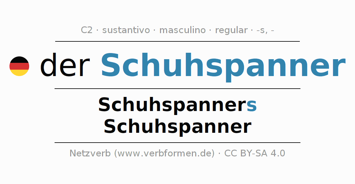 La declinación del sustantivoSchuhspanner (calzador, extensor de zapato) se encuentra en genitivoSchuhspanners del singular y en el nominativoSchuhspanner del plural. El sustantivo Schuhspanner se conjuga de forma fuerte (irregular) con estas terminaciones s/-. El género gramatical de Schuhspanner es masculino y por eso se requiere el artículo definido ‘der’. Aquí puedes declinar no solamente Schuhspanner sino también todos los sustantivos alemanes . Este sustantivo pertenece al vocabulario necesario para pasar el examen "Zertifikat Deutsch" o para el nivel C2. Comentarios ☆