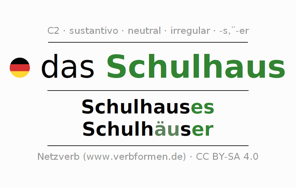 La declinación del sustantivoSchulhaus (escuela, colegio) se encuentra en genitivoSchulhauses del singular y en el nominativoSchulhäuser del plural. El sustantivo Schulhaus se conjuga de forma fuerte (irregular) con estas terminaciones es/äu-er. El plural requiere el uso de diéresis. El género gramatical de Schulhaus es neutro y por eso se requiere el artículo definido ‘das’. Aquí puedes declinar no solamente Schulhaus sino también todos los sustantivos alemanes . Este sustantivo pertenece al vocabulario necesario para pasar el examen "Zertifikat Deutsch" o para el nivel C2. Comentarios ☆
