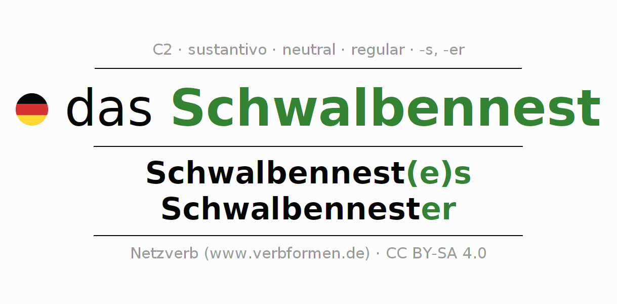 La declinación del sustantivoSchwalbennest (nido de golondrina) se encuentra en genitivoSchwalbennest(e)s del singular y en el nominativoSchwalbennester del plural. El sustantivo Schwalbennest se conjuga de forma fuerte (irregular) con estas terminaciones es/er. El género gramatical de Schwalbennest es neutro y por eso se requiere el artículo definido ‘das’. Aquí puedes declinar no solamente Schwalbennest sino también todos los sustantivos alemanes . Este sustantivo pertenece al vocabulario necesario para pasar el examen "Zertifikat Deutsch" o para el nivel C2. Comentarios ☆