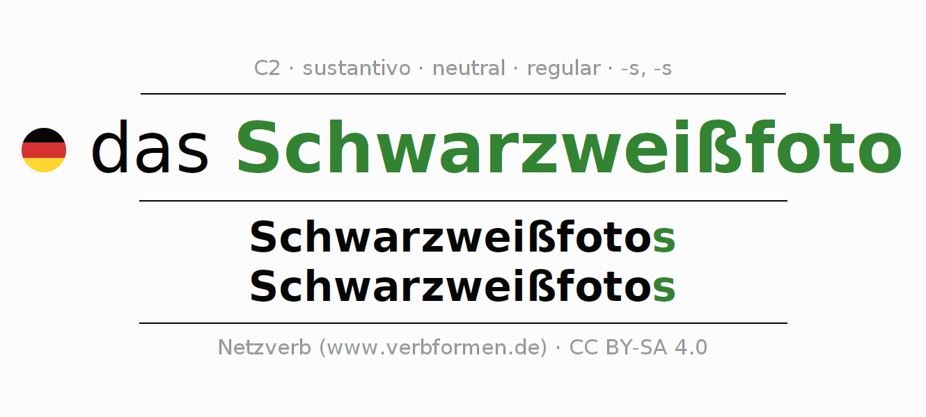 La declinación del sustantivo en forma de tabla con todas su formas: singular, plural y en los cuatro casos: nominativo (primer caso), genitivo (segundo caso), dativo (tercer caso) y acusativo (cuarto caso). Las construcciones gramaticales están representadas de forma clara en una tabla sinópica. La inflexión de los sustantivos es una ayuda durante tareas, exámenes, para cursos de alemán, la universidad, el estudio del alemán como lengua extranjera o como segundo idioma y para estudiantes adultos. La declinación correcta de las palabras es especialmente importante para los que aprenden el idioma alemán. Aquí encontraras más información acerca del tema Wiktionary Schwarzweißfoto y aquí también a través del Duden Schwarzweißfoto.