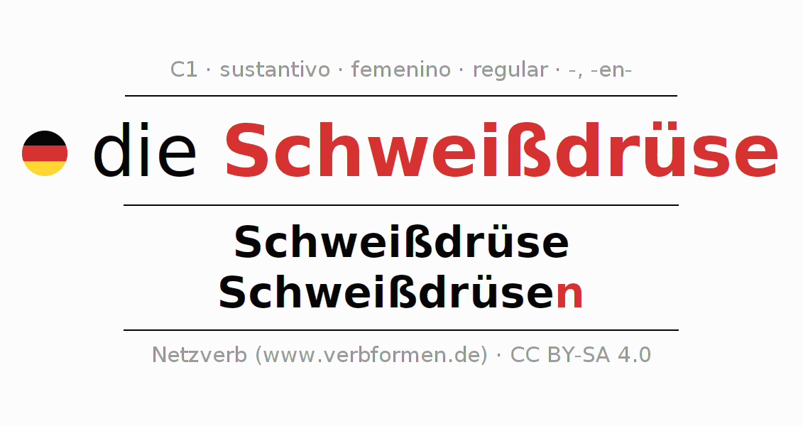 La declinación del sustantivo en forma de tabla con todas su formas: singular, plural y en los cuatro casos: nominativo (primer caso), genitivo (segundo caso), dativo (tercer caso) y acusativo (cuarto caso). Las construcciones gramaticales están representadas de forma clara en una tabla sinópica. La inflexión de los sustantivos es una ayuda durante tareas, exámenes, para cursos de alemán, la universidad, el estudio del alemán como lengua extranjera o como segundo idioma y para estudiantes adultos. La declinación correcta de las palabras es especialmente importante para los que aprenden el idioma alemán. Aquí encontraras más información acerca del tema Wiktionary Schweißdrüse y aquí también a través del Duden Schweißdrüse.