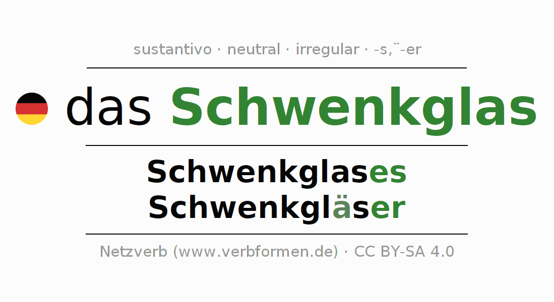 La declinación del sustantivo en forma de tabla con todas su formas: singular, plural y en los cuatro casos: nominativo (primer caso), genitivo (segundo caso), dativo (tercer caso) y acusativo (cuarto caso). Las construcciones gramaticales están representadas de forma clara en una tabla sinópica. La inflexión de los sustantivos es una ayuda durante tareas, exámenes, para cursos de alemán, la universidad, el estudio del alemán como lengua extranjera o como segundo idioma y para estudiantes adultos. La declinación correcta de las palabras es especialmente importante para los que aprenden el idioma alemán. Aquí encontraras más información acerca del tema Wiktionary Schwenkglas y aquí también a través del Duden Schwenkglas.