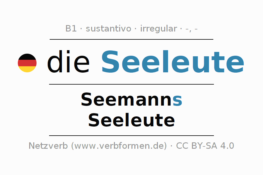 La declinación del sustantivo en forma de tabla con todas su formas: singular, plural y en los cuatro casos: nominativo (primer caso), genitivo (segundo caso), dativo (tercer caso) y acusativo (cuarto caso). Las construcciones gramaticales están representadas de forma clara en una tabla sinópica. La inflexión de los sustantivos es una ayuda durante tareas, exámenes, para cursos de alemán, la universidad, el estudio del alemán como lengua extranjera o como segundo idioma y para estudiantes adultos. La declinación correcta de las palabras es especialmente importante para los que aprenden el idioma alemán. Aquí encontraras más información acerca del tema Wiktionary Seeleute y aquí también a través del Duden Seeleute.