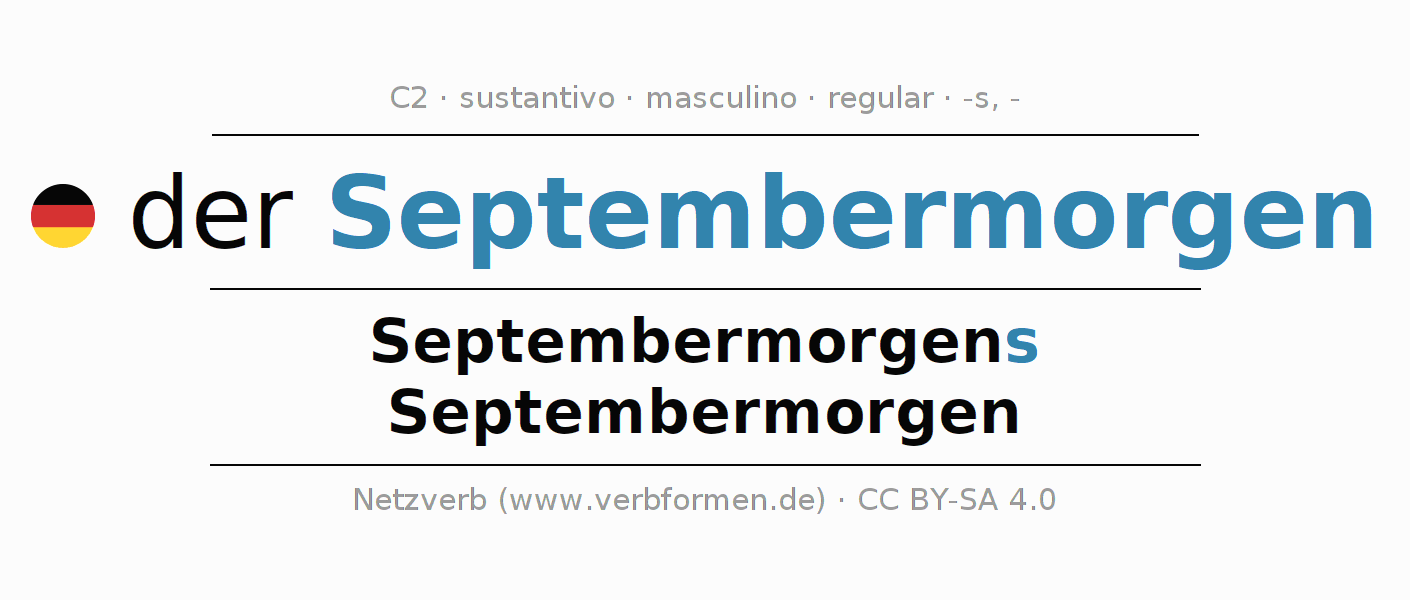 La declinación del sustantivo en forma de tabla con todas su formas: singular, plural y en los cuatro casos: nominativo (primer caso), genitivo (segundo caso), dativo (tercer caso) y acusativo (cuarto caso). Las construcciones gramaticales están representadas de forma clara en una tabla sinópica. La inflexión de los sustantivos es una ayuda durante tareas, exámenes, para cursos de alemán, la universidad, el estudio del alemán como lengua extranjera o como segundo idioma y para estudiantes adultos. La declinación correcta de las palabras es especialmente importante para los que aprenden el idioma alemán. Aquí encontraras más información acerca del tema Wiktionary Septembermorgen y aquí también a través del Duden Septembermorgen.