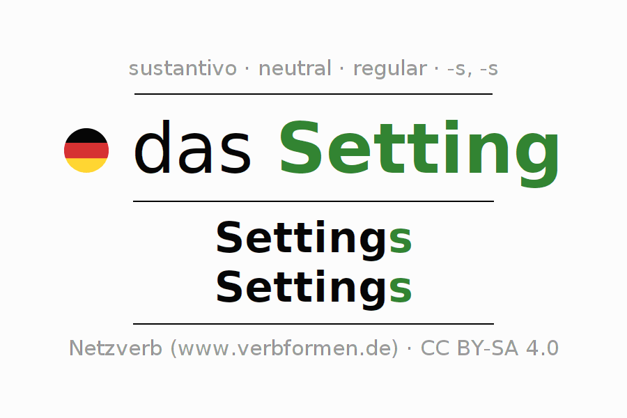 La declinación del sustantivoSetting (contexto, entorno) se encuentra en genitivoSettings del singular y en el nominativoSettings del plural. El sustantivo Setting se conjuga de forma fuerte (irregular) con estas terminaciones s/s. El género gramatical de Setting es neutro y por eso se requiere el artículo definido ‘das’. Aquí puedes declinar no solamente Setting sino también todos los sustantivos alemanes . Comentarios ☆