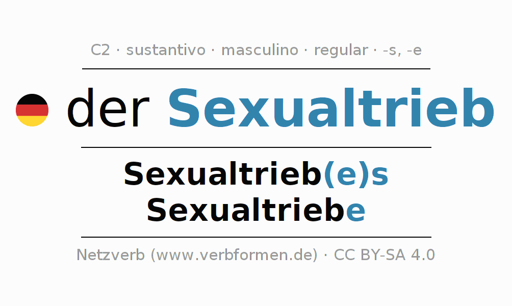 La declinación del sustantivoSexualtrieb (deseo sexual, impulso sexual) se encuentra en genitivoSexualtrieb(e)s del singular y en el nominativoSexualtriebe del plural. El sustantivo Sexualtrieb se conjuga de forma fuerte (irregular) con estas terminaciones es/e. El género gramatical de Sexualtrieb es masculino y por eso se requiere el artículo definido ‘der’. Aquí puedes declinar no solamente Sexualtrieb sino también todos los sustantivos alemanes . Este sustantivo pertenece al vocabulario necesario para pasar el examen "Zertifikat Deutsch" o para el nivel C2. Comentarios ☆