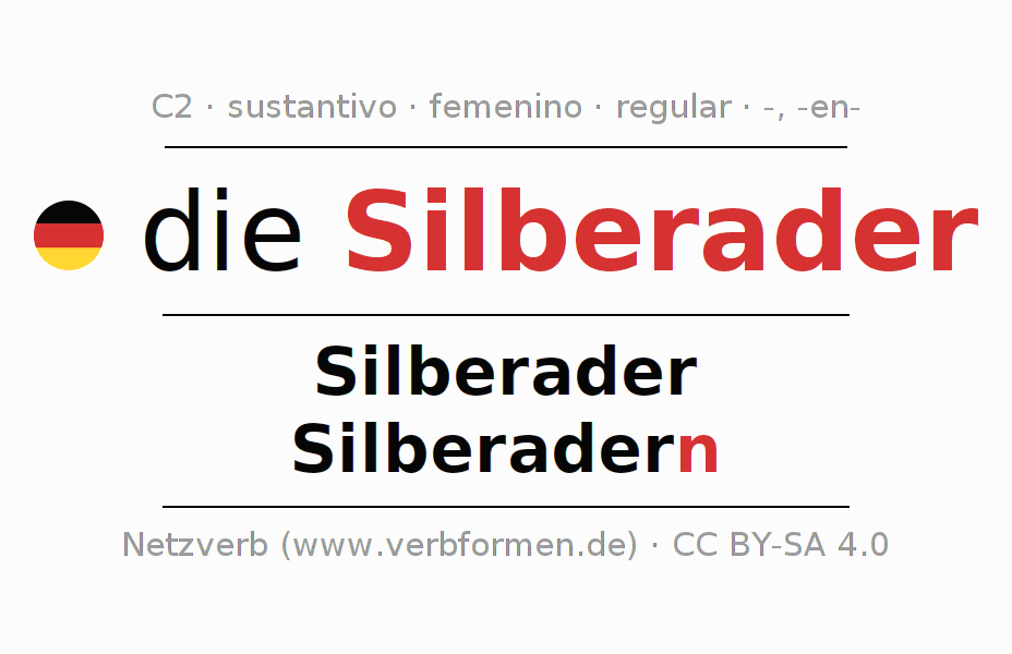 La declinación del sustantivo en forma de tabla con todas su formas: singular, plural y en los cuatro casos: nominativo (primer caso), genitivo (segundo caso), dativo (tercer caso) y acusativo (cuarto caso). Las construcciones gramaticales están representadas de forma clara en una tabla sinópica. La inflexión de los sustantivos es una ayuda durante tareas, exámenes, para cursos de alemán, la universidad, el estudio del alemán como lengua extranjera o como segundo idioma y para estudiantes adultos. La declinación correcta de las palabras es especialmente importante para los que aprenden el idioma alemán. Aquí encontraras más información acerca del tema Wiktionary Silberader y aquí también a través del Duden Silberader.