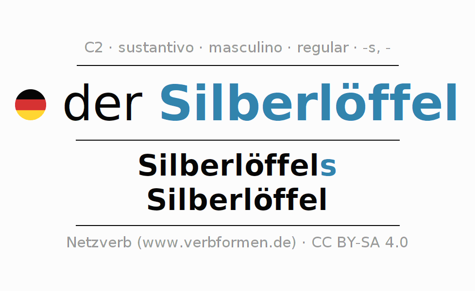 La declinación del sustantivo en forma de tabla con todas su formas: singular, plural y en los cuatro casos: nominativo (primer caso), genitivo (segundo caso), dativo (tercer caso) y acusativo (cuarto caso). Las construcciones gramaticales están representadas de forma clara en una tabla sinópica. La inflexión de los sustantivos es una ayuda durante tareas, exámenes, para cursos de alemán, la universidad, el estudio del alemán como lengua extranjera o como segundo idioma y para estudiantes adultos. La declinación correcta de las palabras es especialmente importante para los que aprenden el idioma alemán. Aquí encontraras más información acerca del tema Wiktionary Silberlöffel y aquí también a través del Duden Silberlöffel.