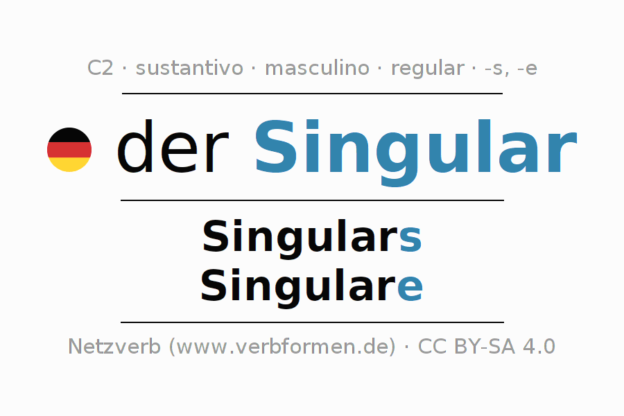 La declinación del sustantivo en forma de tabla con todas su formas: singular, plural y en los cuatro casos: nominativo (primer caso), genitivo (segundo caso), dativo (tercer caso) y acusativo (cuarto caso). Las construcciones gramaticales están representadas de forma clara en una tabla sinópica. La inflexión de los sustantivos es una ayuda durante tareas, exámenes, para cursos de alemán, la universidad, el estudio del alemán como lengua extranjera o como segundo idioma y para estudiantes adultos. La declinación correcta de las palabras es especialmente importante para los que aprenden el idioma alemán. Aquí encontraras más información acerca del tema Wiktionary Singular y aquí también a través del Duden Singular.