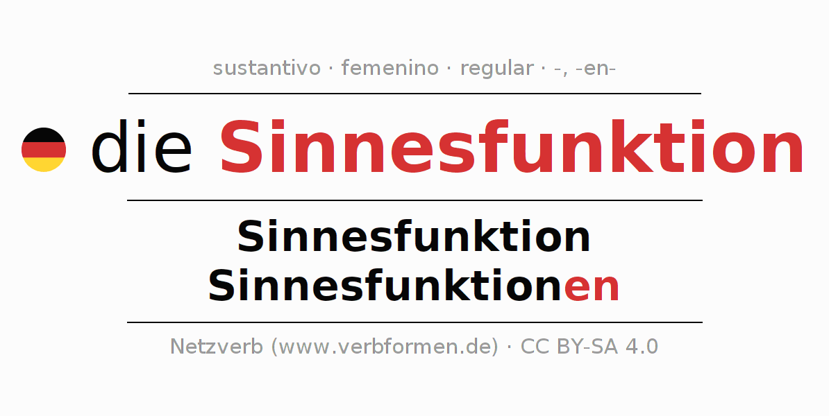 La declinación del sustantivo en forma de tabla con todas su formas: singular, plural y en los cuatro casos: nominativo (primer caso), genitivo (segundo caso), dativo (tercer caso) y acusativo (cuarto caso). Las construcciones gramaticales están representadas de forma clara en una tabla sinópica. La inflexión de los sustantivos es una ayuda durante tareas, exámenes, para cursos de alemán, la universidad, el estudio del alemán como lengua extranjera o como segundo idioma y para estudiantes adultos. La declinación correcta de las palabras es especialmente importante para los que aprenden el idioma alemán. Aquí encontraras más información acerca del tema Wiktionary Sinnesfunktion y aquí también a través del Duden Sinnesfunktion.