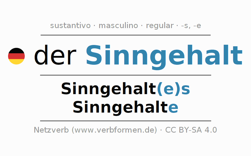 La declinación del sustantivo en forma de tabla con todas su formas: singular, plural y en los cuatro casos: nominativo (primer caso), genitivo (segundo caso), dativo (tercer caso) y acusativo (cuarto caso). Las construcciones gramaticales están representadas de forma clara en una tabla sinópica. La inflexión de los sustantivos es una ayuda durante tareas, exámenes, para cursos de alemán, la universidad, el estudio del alemán como lengua extranjera o como segundo idioma y para estudiantes adultos. La declinación correcta de las palabras es especialmente importante para los que aprenden el idioma alemán. Aquí encontraras más información acerca del tema Wiktionary Sinngehalt y aquí también a través del Duden Sinngehalt.