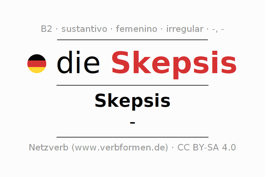 La declinación del sustantivo en forma de tabla con todas su formas: singular, plural y en los cuatro casos: nominativo (primer caso), genitivo (segundo caso), dativo (tercer caso) y acusativo (cuarto caso). Las construcciones gramaticales están representadas de forma clara en una tabla sinópica. La inflexión de los sustantivos es una ayuda durante tareas, exámenes, para cursos de alemán, la universidad, el estudio del alemán como lengua extranjera o como segundo idioma y para estudiantes adultos. La declinación correcta de las palabras es especialmente importante para los que aprenden el idioma alemán. Aquí encontraras más información acerca del tema Wiktionary Skepsis y aquí también a través del Duden Skepsis.