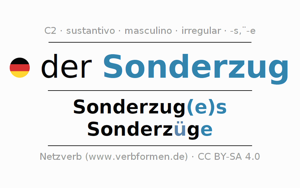 La declinación del sustantivo en forma de tabla con todas su formas: singular, plural y en los cuatro casos: nominativo (primer caso), genitivo (segundo caso), dativo (tercer caso) y acusativo (cuarto caso). Las construcciones gramaticales están representadas de forma clara en una tabla sinópica. La inflexión de los sustantivos es una ayuda durante tareas, exámenes, para cursos de alemán, la universidad, el estudio del alemán como lengua extranjera o como segundo idioma y para estudiantes adultos. La declinación correcta de las palabras es especialmente importante para los que aprenden el idioma alemán. Aquí encontraras más información acerca del tema Wiktionary Sonderzug y aquí también a través del Duden Sonderzug.
