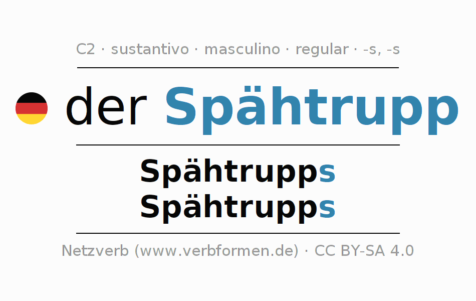 La declinación del sustantivo en forma de tabla con todas su formas: singular, plural y en los cuatro casos: nominativo (primer caso), genitivo (segundo caso), dativo (tercer caso) y acusativo (cuarto caso). Las construcciones gramaticales están representadas de forma clara en una tabla sinópica. La inflexión de los sustantivos es una ayuda durante tareas, exámenes, para cursos de alemán, la universidad, el estudio del alemán como lengua extranjera o como segundo idioma y para estudiantes adultos. La declinación correcta de las palabras es especialmente importante para los que aprenden el idioma alemán. Aquí encontraras más información acerca del tema Wiktionary Spähtrupp y aquí también a través del Duden Spähtrupp.